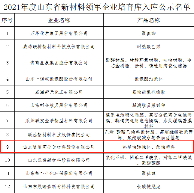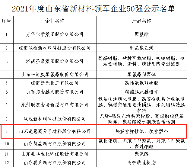 日前,2021年度山东省新材料领军企业培育库入库名单和2021年山东省新材料领军企业50强名单出炉。快盈VIII股份的热塑性弹性体、改性塑料入围上述榜单。